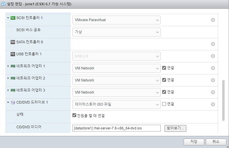 LLT나 이런건 나중에 따로 정리할 지 모르겠지만, 보통 LLT용으로 2개, 만약을 대비한 실제 사용하는 네트워크 망을 Low Priority 용으로 1개 주려고 한다. 그래서 총 3개의 NIC를 만들었다. CD/DVD에는 미리 RHEL 7.8을 넣어뒀다.