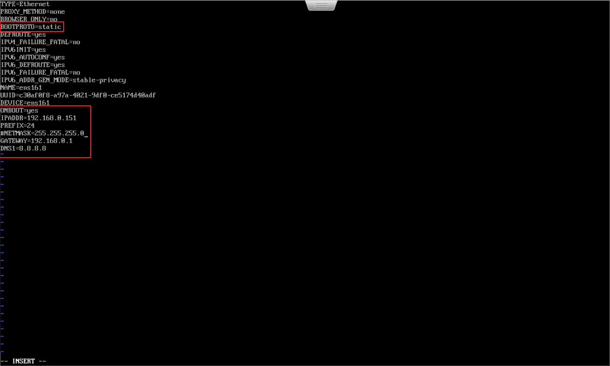 | IPADDR=192.168.0.151 PREFIX=24 # NETMASK=255.255.255.0 GATEWAY=192.168.0.1 DNS1=8.8.8.8 |